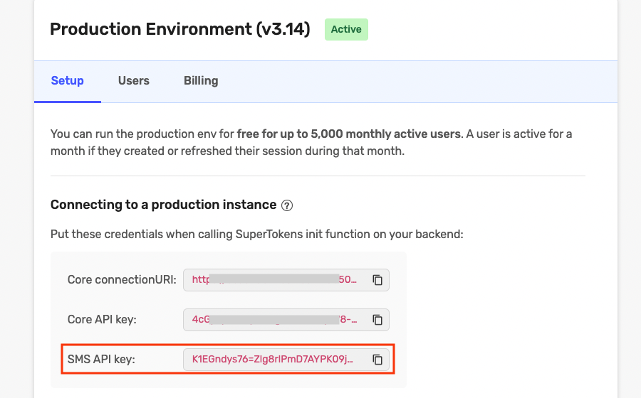 - Once the production env is created, you can find your SMS API key under the setup section: